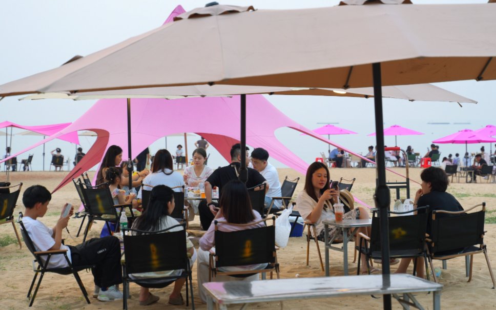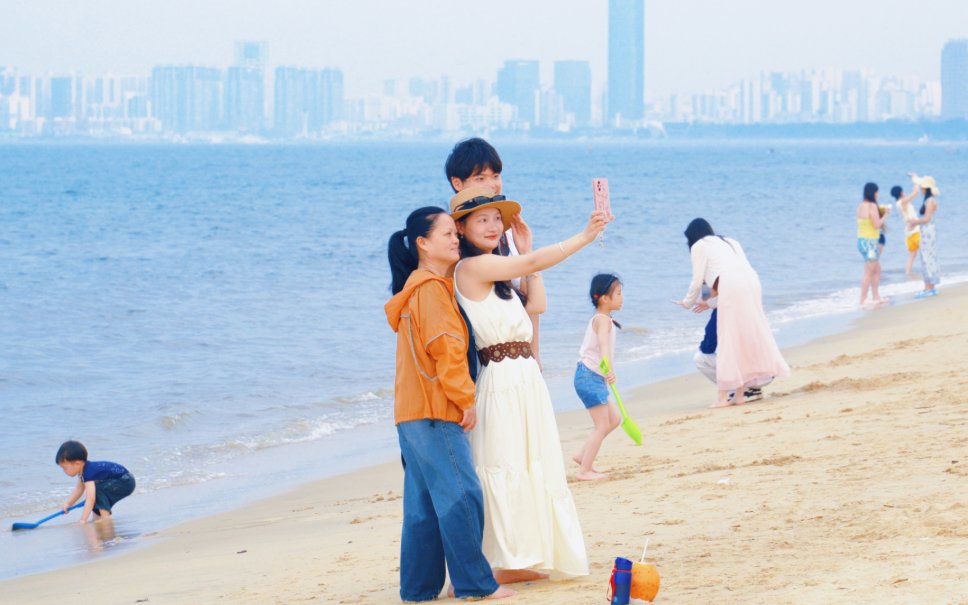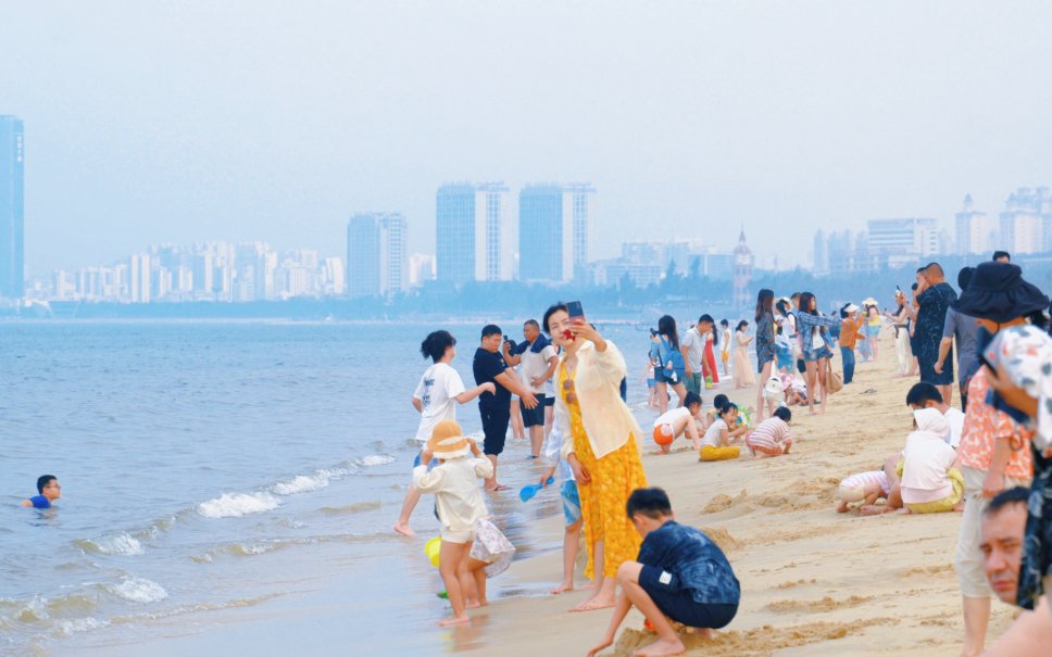 假日海滩则延续热闹,沙滩上游人密集,椰林烧烤园香气四溢,孩子们堆沙堡,情侣们漫步踏浪,氛围欢快。为保障游玩安全,景区增设救生员巡逻点位,通过广播循环播报安全提示,让市民、游客玩得尽兴更安心。