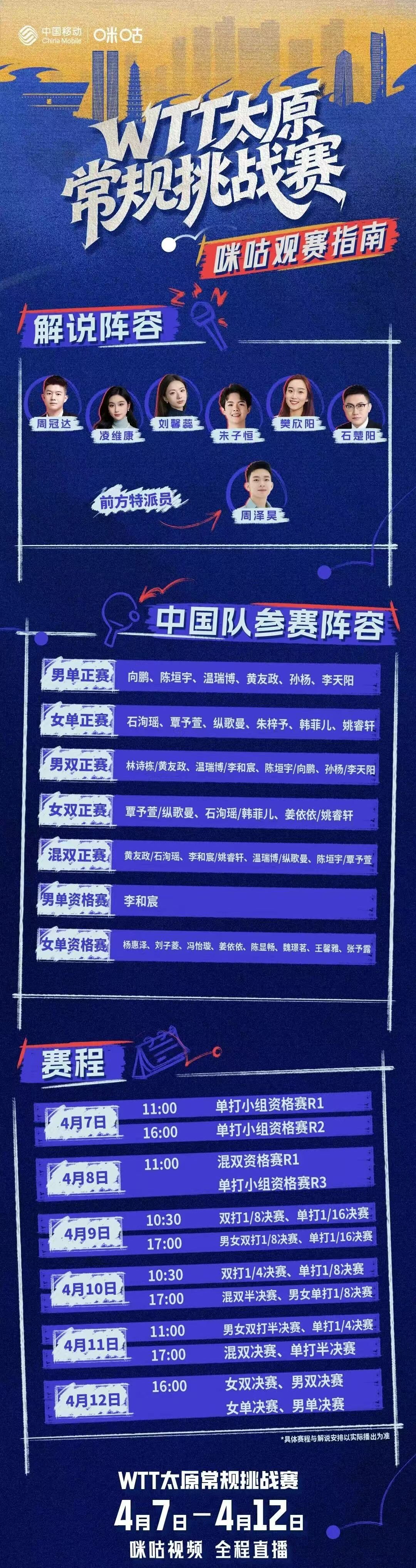 赛事设男单、女单、男双、女双、混双5个比赛项目,冠军可获400点世界排名积分。中国队22人出战,多位新生代小将亮相。这是林诗栋因伤缺席两项世界顶级大赛后,首次复出参赛。
