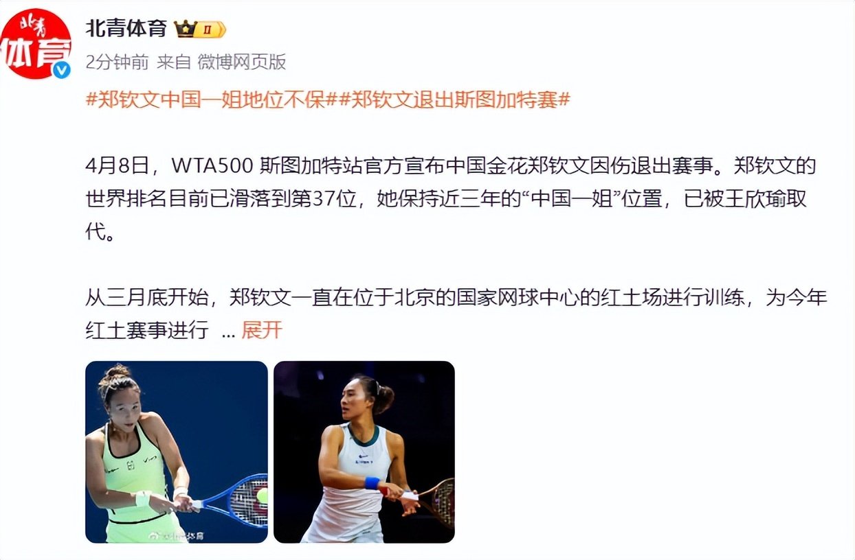 4月8日,WTA500 斯图加特站官方宣布中国金花郑钦文因伤退出赛事。郑钦文的世界排名目前已滑落到第37位,她保持近三年的“中国一姐”位置,已被王欣瑜取代。