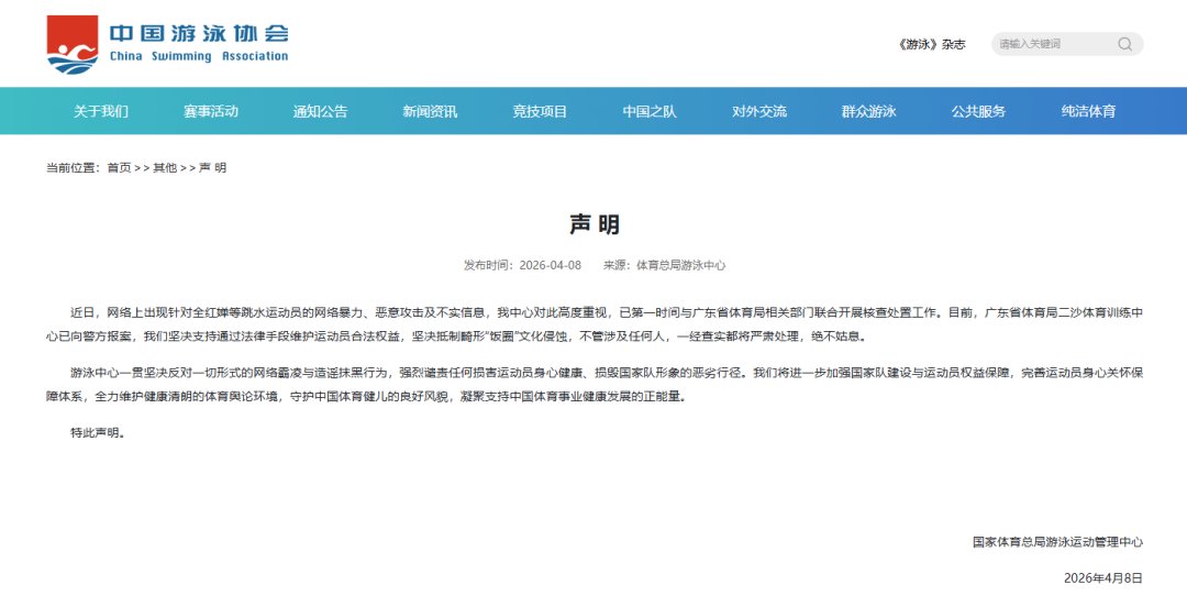 声明明确表示,游泳中心一贯坚决反对一切形式的网络霸凌与造谣抹黑行为,强烈谴责任何损害运动员身心健康、损毁国家队形象的恶劣行径。中心将进一步加强国家队建设与运动员权益保障,完善运动员身心关怀保障体系,全力维护健康清朗的体育舆论环境,守护中国体育健儿的良好风貌,凝聚支持中国体育事业健康发展的正能量。