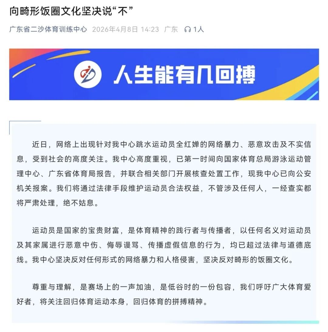 4月8日,针对跳水运动员全红婵涉嫌遭受网络暴力、恶意攻击及不实信息一事,广东省二沙体育训练中心与体育总局游泳中心先后发表声明,明确表示坚决反对网络暴力,已由广东省二沙体育训练中心向公安机关报案,将通过法律手段维护运动员合法权益。