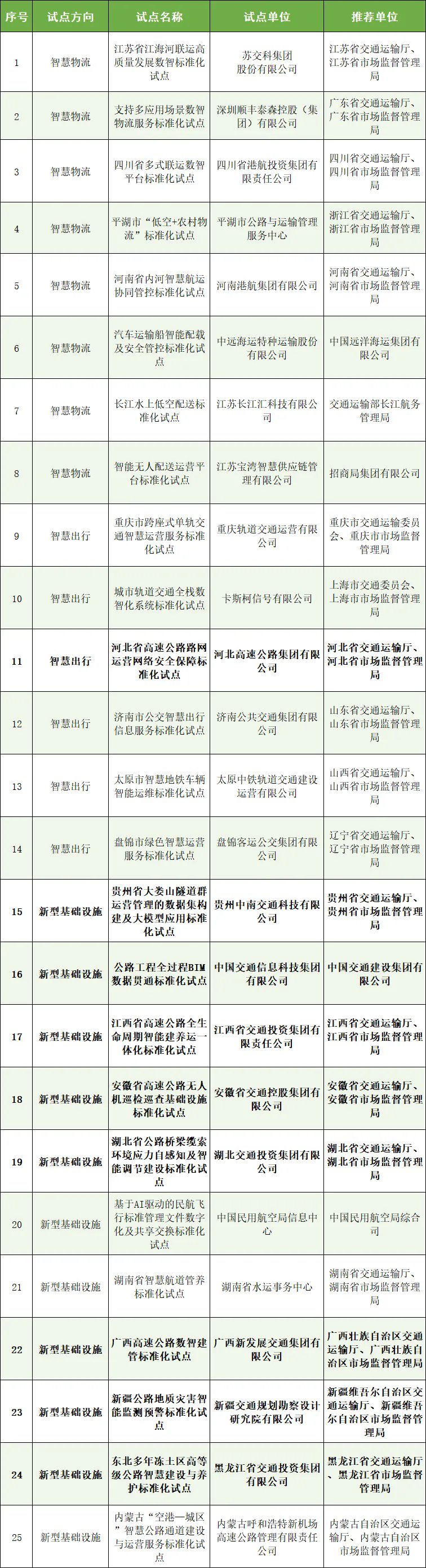 近日,为充分发挥标准在智慧交通领域的引领作用,交通运输部、国家市场监督管理总局联合开展了第二批国家标准化试点(智慧交通专项),经申报推荐、专家审查和社会公示,确定了25个试点项目,项目名单如下。
