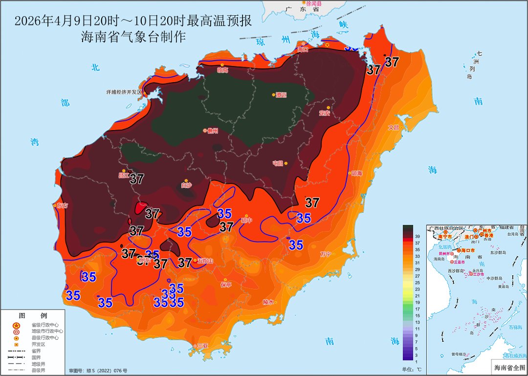 海南省气象局2026年4月9日16时20分继续发布高温三级预警:预计4月10日白天,海口、澄迈、临高、定安、屯昌、儋州、白沙、昌江和东方等9个市县的大部分乡镇将出现37℃以上的高温天气,其中昌江、白沙、儋州、临高和澄迈等部分乡镇气温可达40℃以上,请有关单位做好防暑降温、森林防灭火等相关工作。