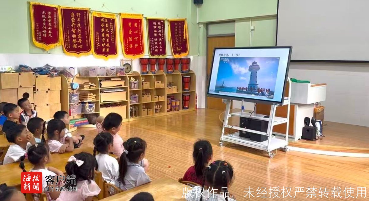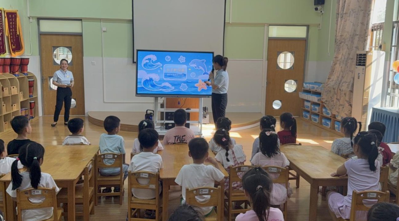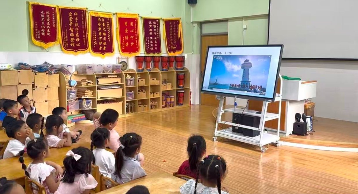 在海洋阅读环节,师生共同诵读《大海究竟是谁的家》,采用领读、跟读与手势演绎相结合的方式,让幼儿在趣味诵读中理解“海洋是万物共生的共同家园”。随后播放的《三沙》科普视频,系统介绍三沙市概况与南海生态保护成果,帮助幼儿认识祖国蓝色国土,厚植家国情怀。