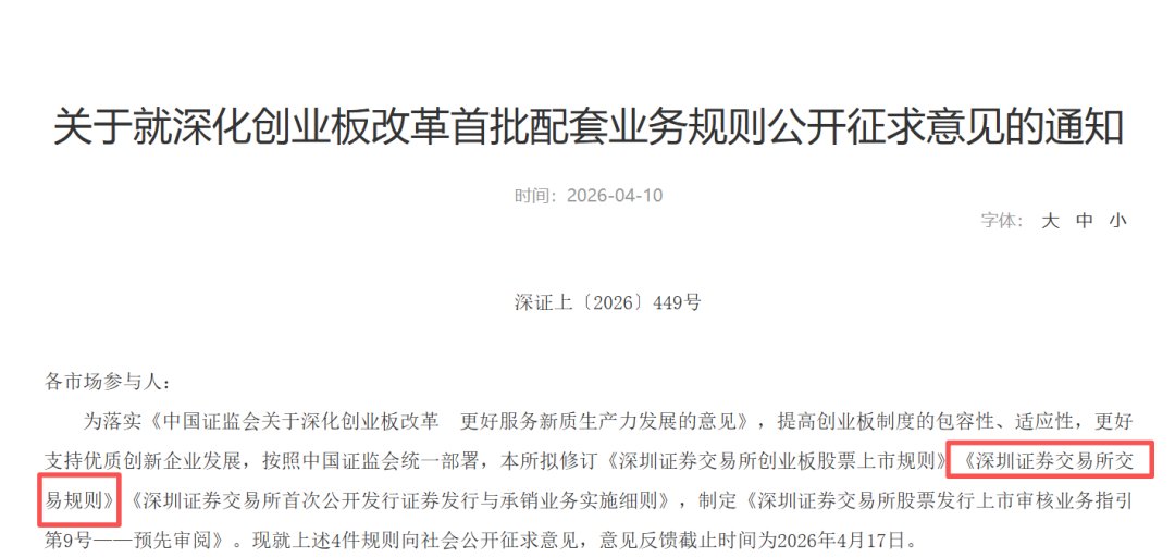 4月10日,深交所发布《关于就深化创业板改革首批配套业务规则公开征求意见的通知》。其中显示,深交所拟修订《深圳证券交易所交易规则》。