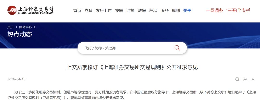 4月10日,上交所官网显示,上交所就修订《上海证券交易所交易规则》公开征求意见。