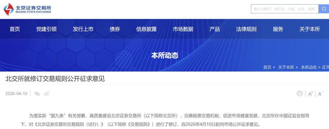 同日,北交所官网显示,北交所就修订交易规则公开征求意见。