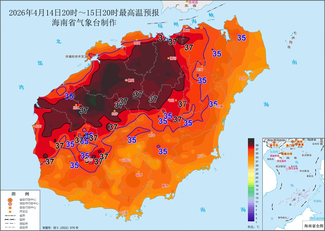 海南省气象局2026年4月14日16时40分将高温三级预警降为高温四级预警:预计4月15日白天,海口、澄迈、临高、定安、屯昌、儋州、白沙、昌江和东方等9个市县的部分乡镇将出现37摄氏度以上的高温天气,请有关单位做好防暑降温、森林防灭火等相关工作。