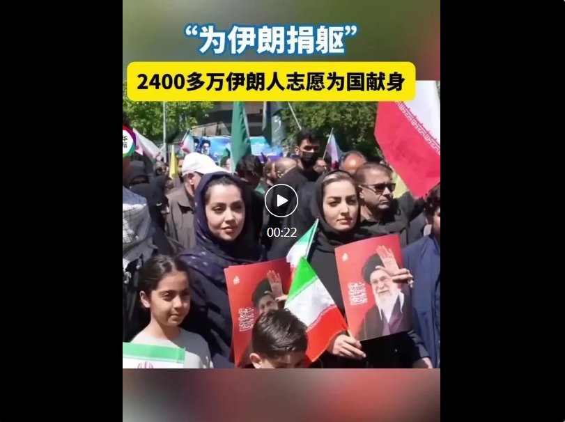报道说,这展现了伊朗人民团结一致、捍卫国家安全以及抵御外来威胁的决心。该活动组织者表示,“为伊朗捐躯”活动源于伊朗社会各界人士在公共媒体和公众空间提出的普遍诉求,旨在创建一个平台,让人们能够自愿表达保卫国家的意愿。该平台的主要目标是为伊朗民众提供一个象征性参与的机会,并记录下他们支持国家安全和领土完整的集体意志。
