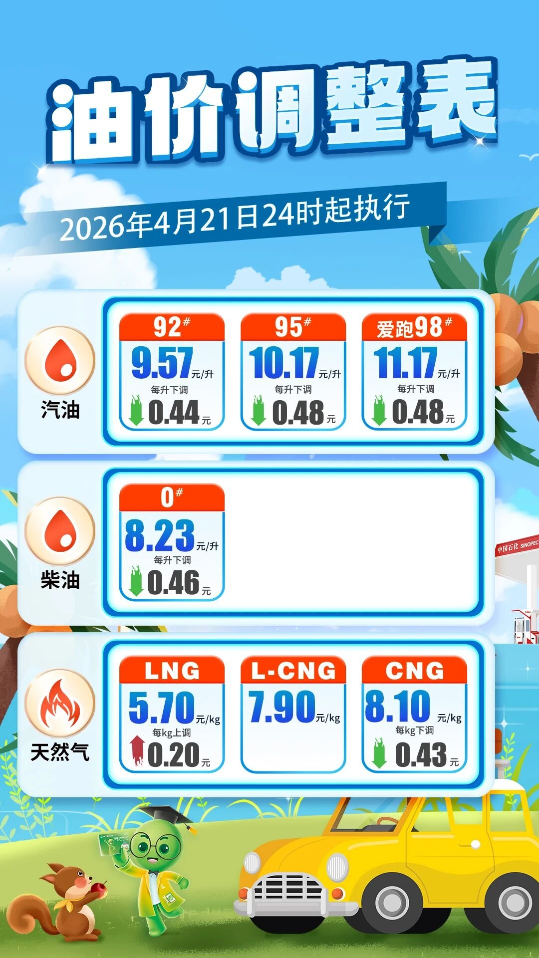 商报全媒体讯(椰网/海拔新闻记者 荆胜欣)根据国家发展改革委官网新闻发布中心2026年4月21日公布的国内成品油价格调价信息,国内汽、柴油价格(标准品)每吨分别下调555元和530元。记者从海南省发改委官网获悉,省发展改革委按照国家发展改革委公布的成品油价格,调整海南汽、柴油最高零售价格,自2026年4月22日0时起执行。