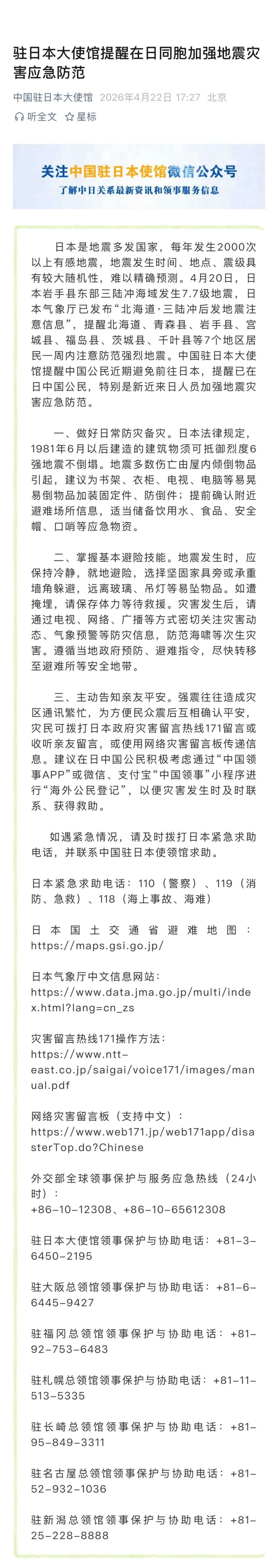 中国驻日本大使馆4月22日发文提醒在日同胞加强地震灾害应急防范:日本是地震多发国家,每年发生2000次以上有感地震,地震发生时间、地点、震级具有较大随机性,难以精确预测。4月20日,日本岩手县东部三陆冲海域发生7.7级地震,日本气象厅已发布“北海道·三陆冲后发地震注意信息”,提醒北海道、青森县、岩手县、宫城县、福岛县、茨城县、千叶县等7个地区居民一周内注意防范强烈地震。中国驻日本大使馆提醒中国公民近期避免前往日本,提醒已在日中国公民,特别是新近来日人员加强地震灾害应急防范。