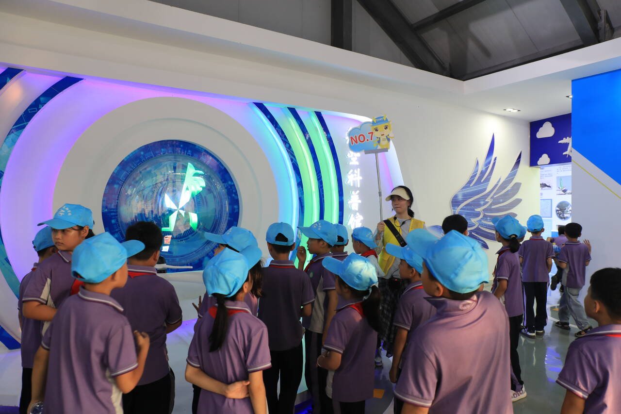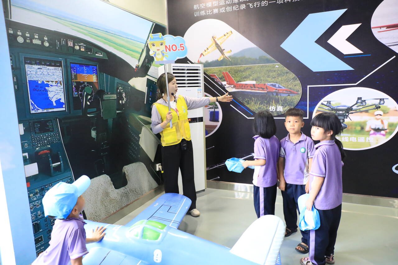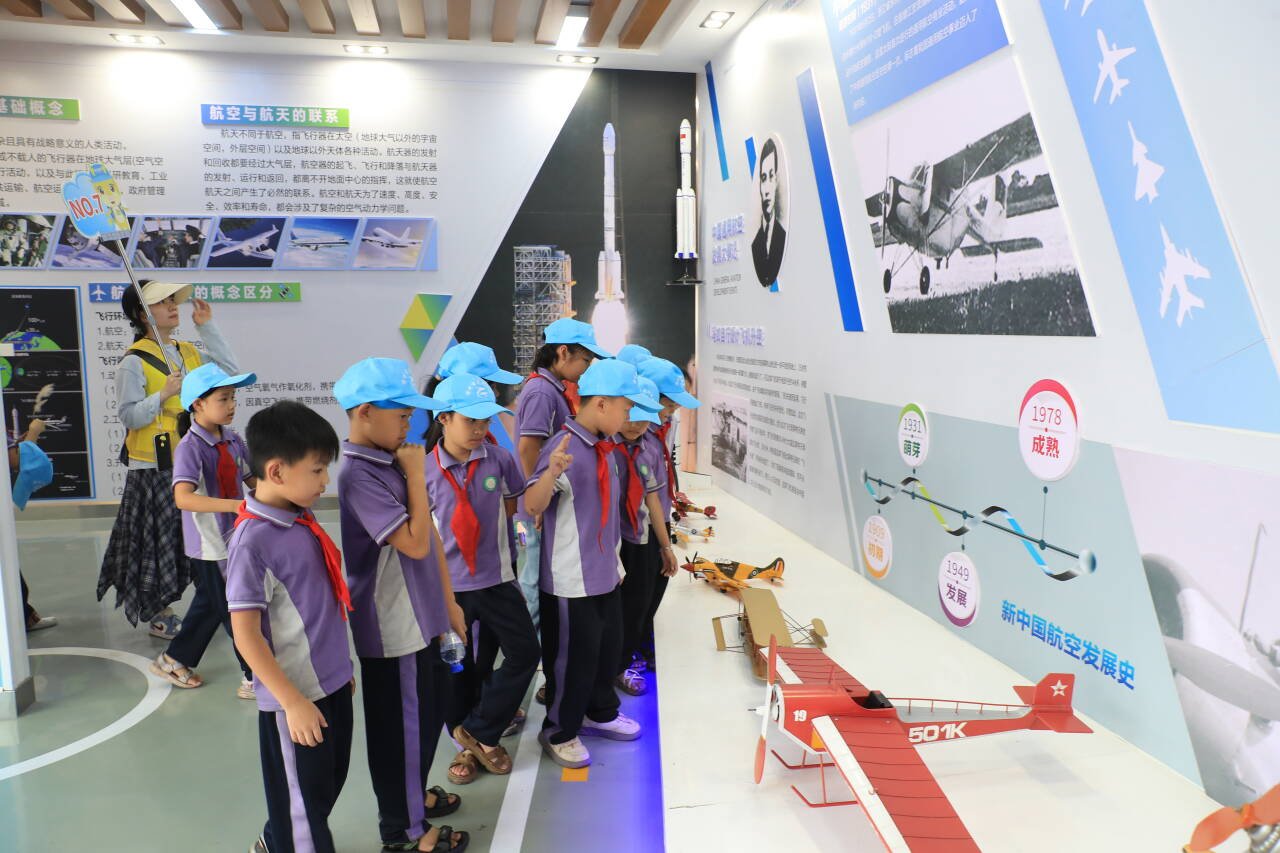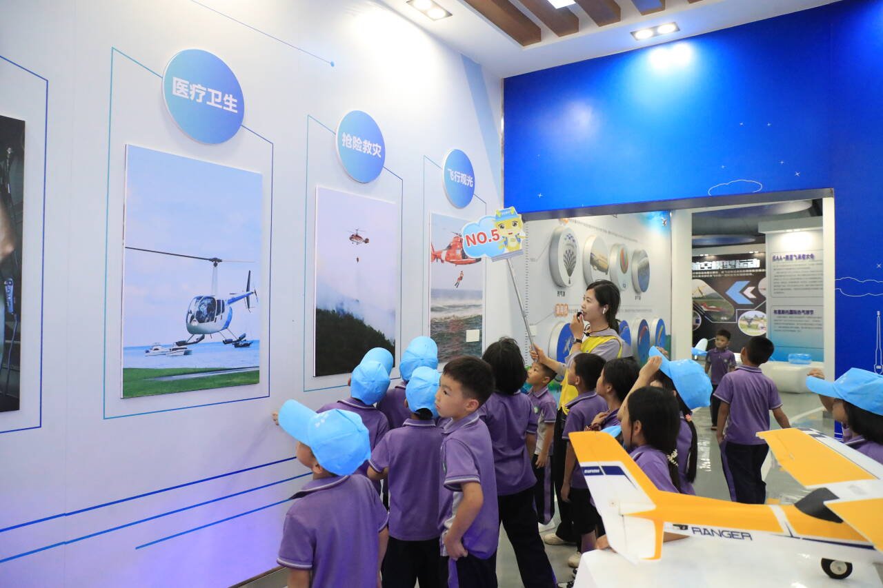 在航空科普馆,学生们通过直升机、无人机等模型,直观了解通用航空的多样类型。展馆围绕国内外航空航天发展历程、航空模型赛事展示、青少年航空知识科普、集团战略主业发展史四个板块展开。基地还设有研学实践区,供学生动手制作弹射飞机模型,在实践中加深对飞行原理的理解。