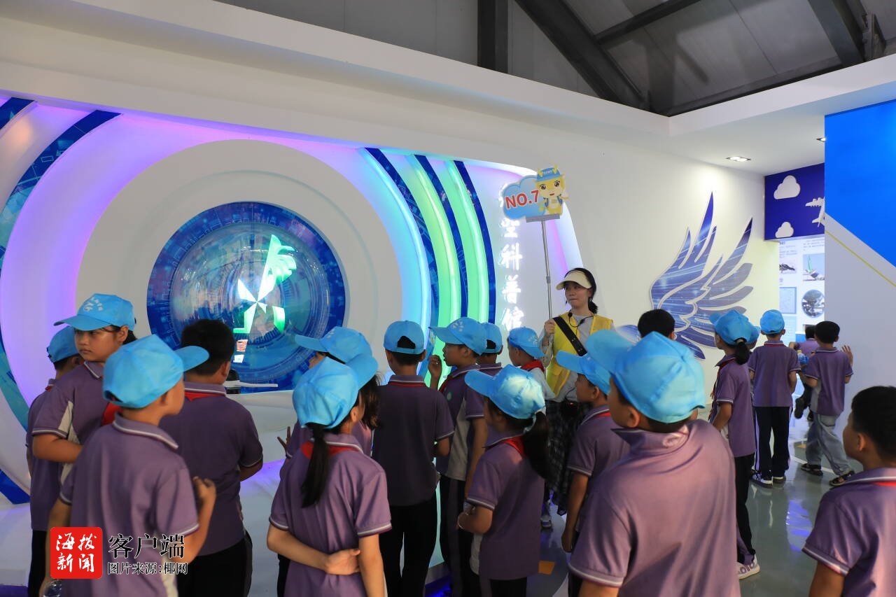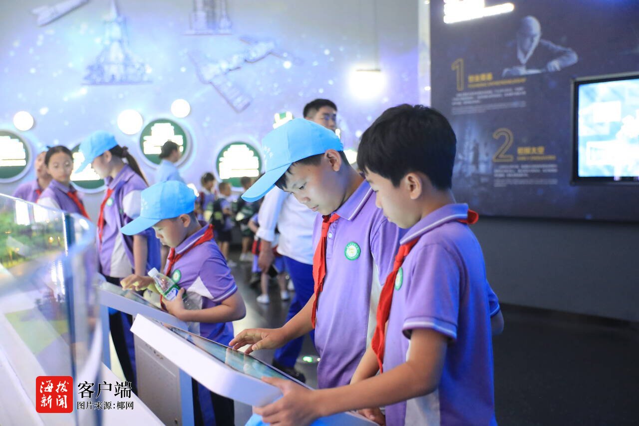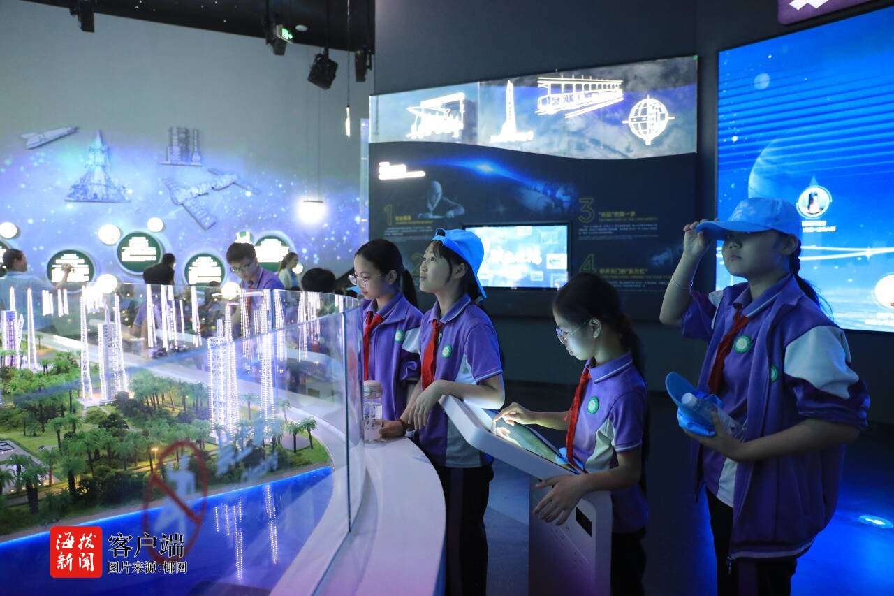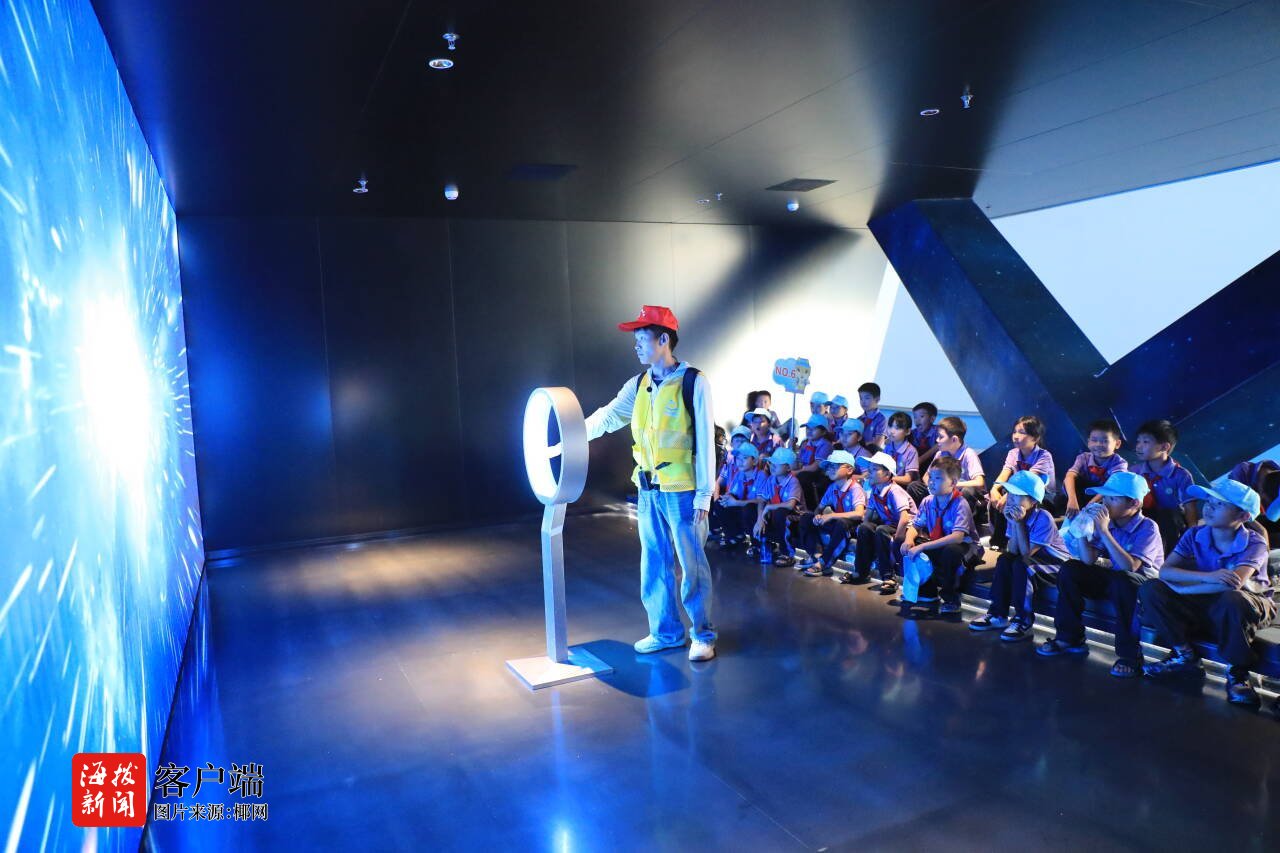 第二站,学生们走进海南科技馆。走进馆内,“好奇天地”“热土探寻”“深海探秘”“深空探梦”四大主题展厅依次展开,如同一部立体的科技百科全书。