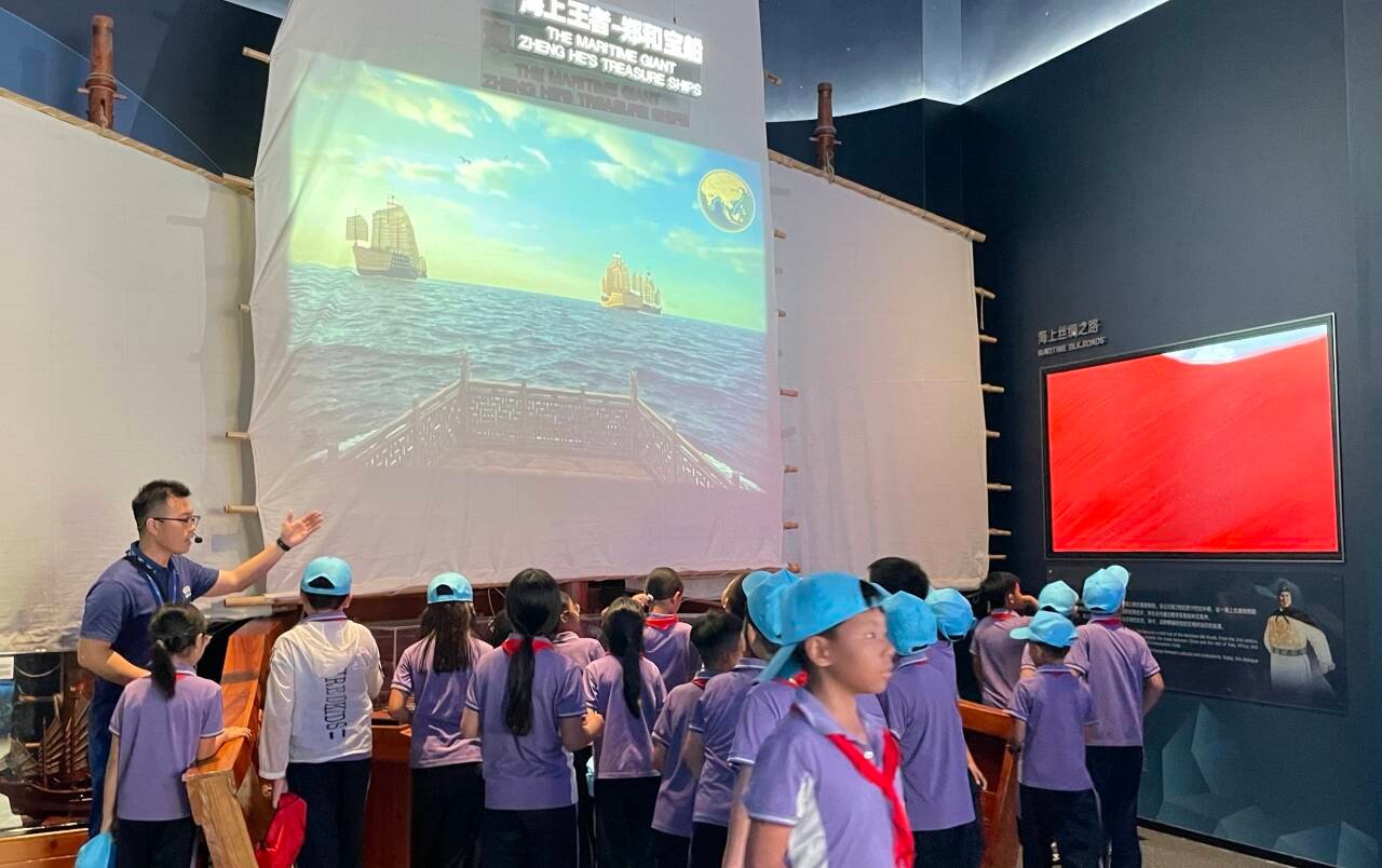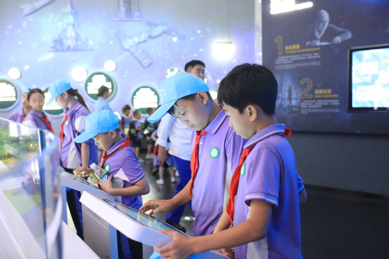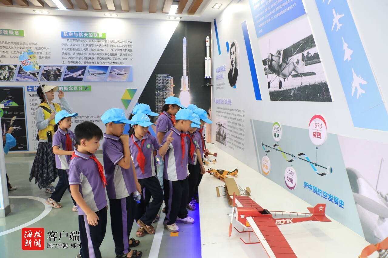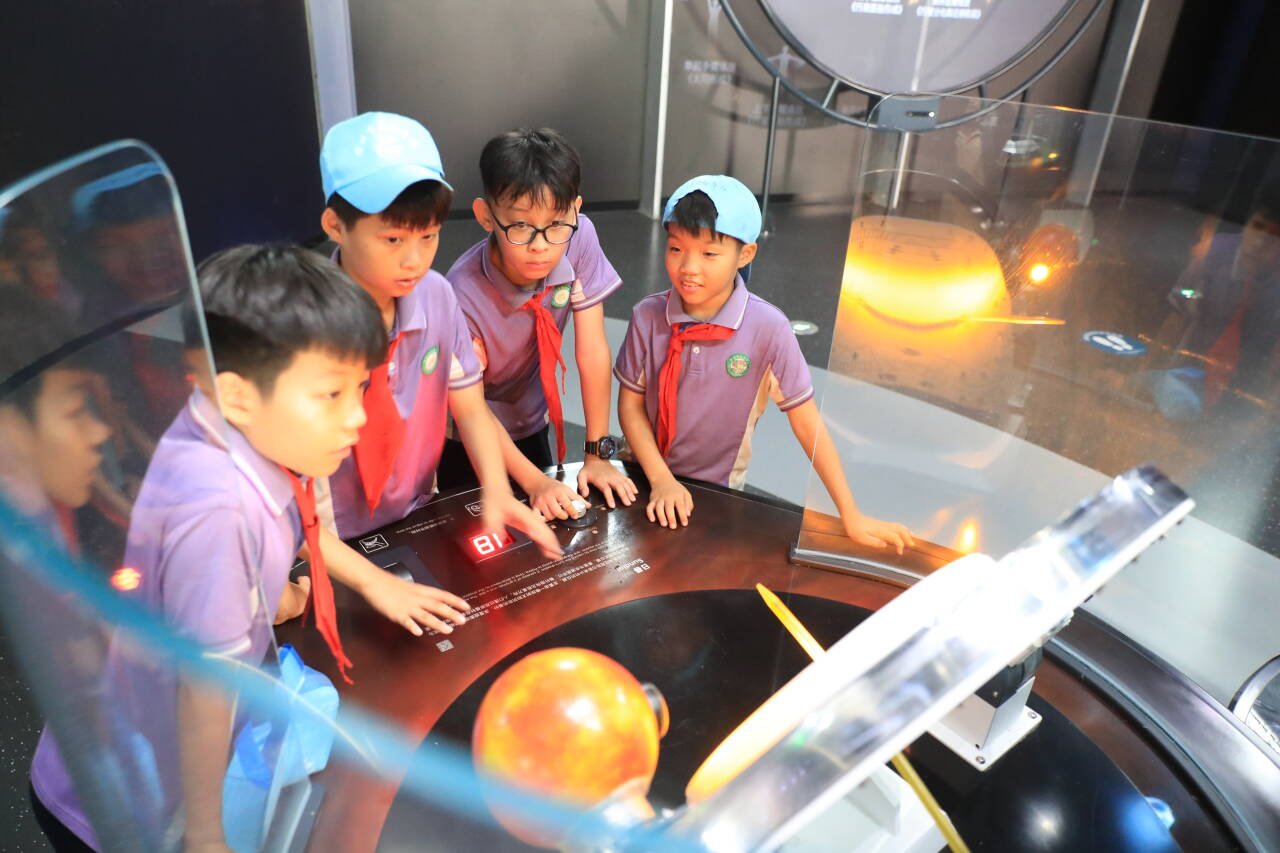第二站,学生们走进海南科技馆。走进馆内,“好奇天地”“热土探寻”“深海探秘”“深空探梦”四大主题展厅依次展开,如同一部立体的科技百科全书。