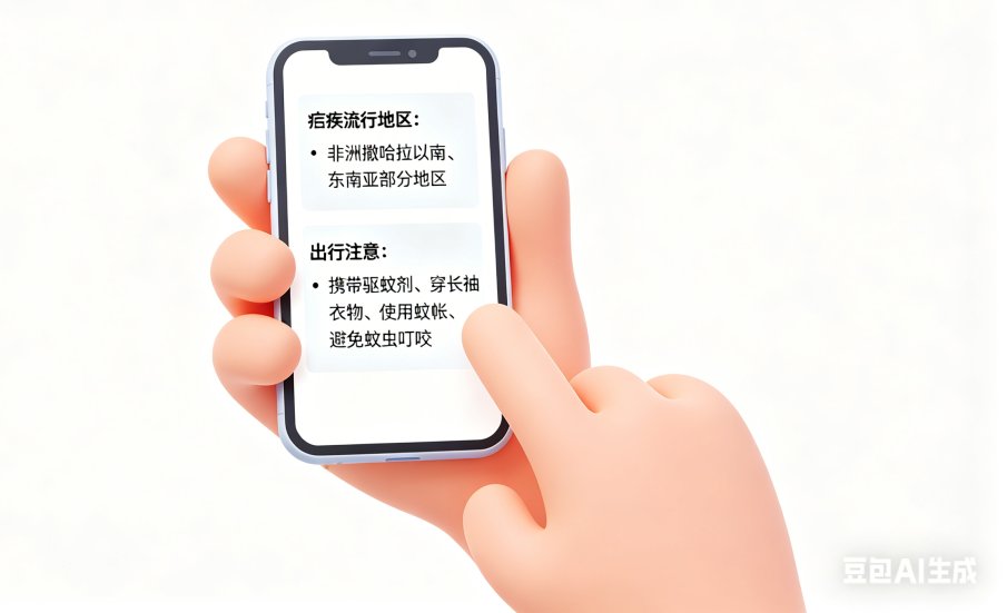 查询世界卫生组织、卫生健康委、海关等部门的网站或公众号,了解目的地疟疾等传染病流行风险与防护建议。